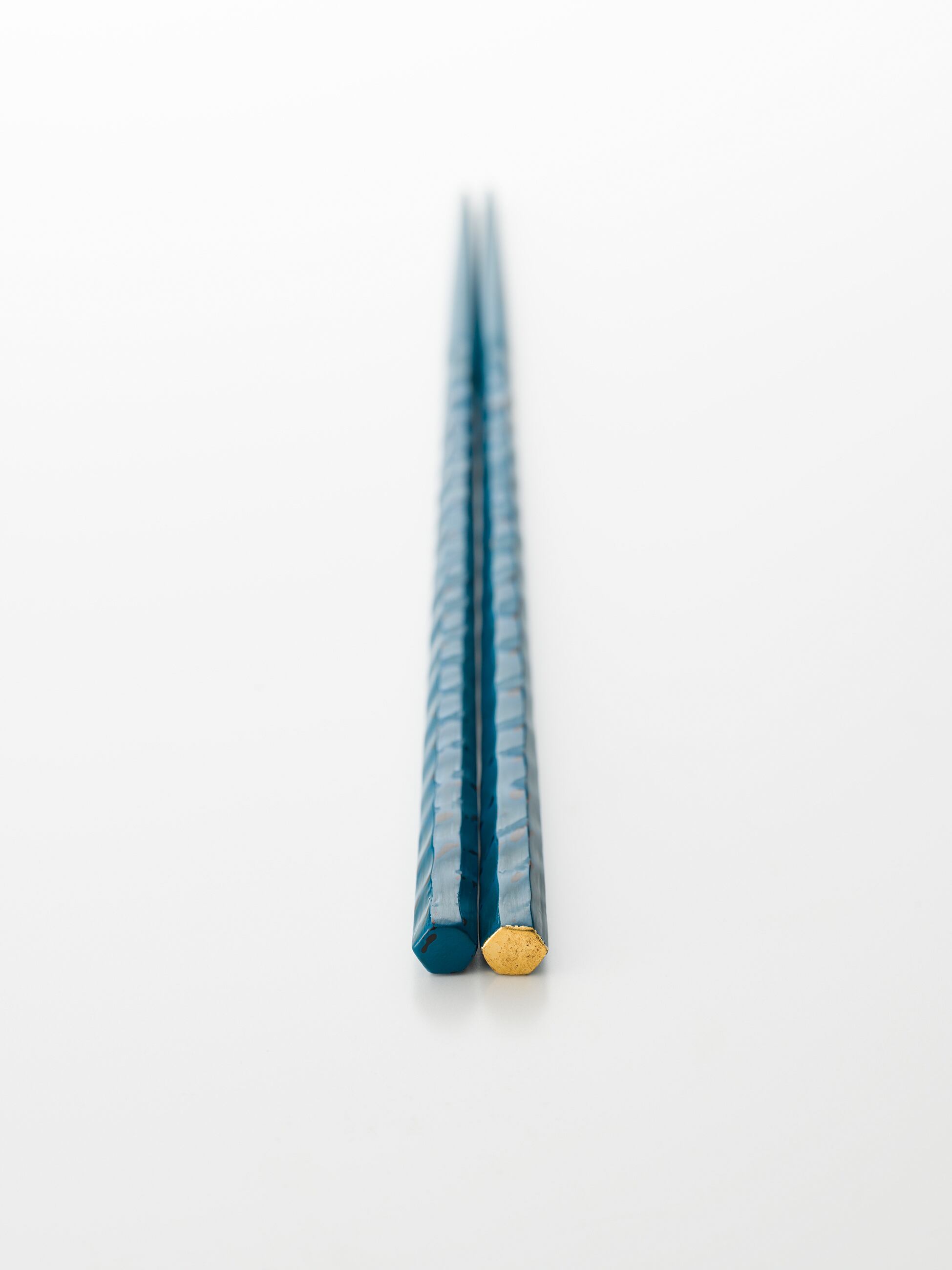 古都鎌倉を代表する伝統工芸「鎌倉彫」の六角箸。丁寧に彫り上げた後、黒漆に青漆を塗り重ね、下地の黒を砥ぎだしています。片方の箸の上端面には金箔を施しアクセントに。全ての工程を手仕事で丁寧に仕上げています。