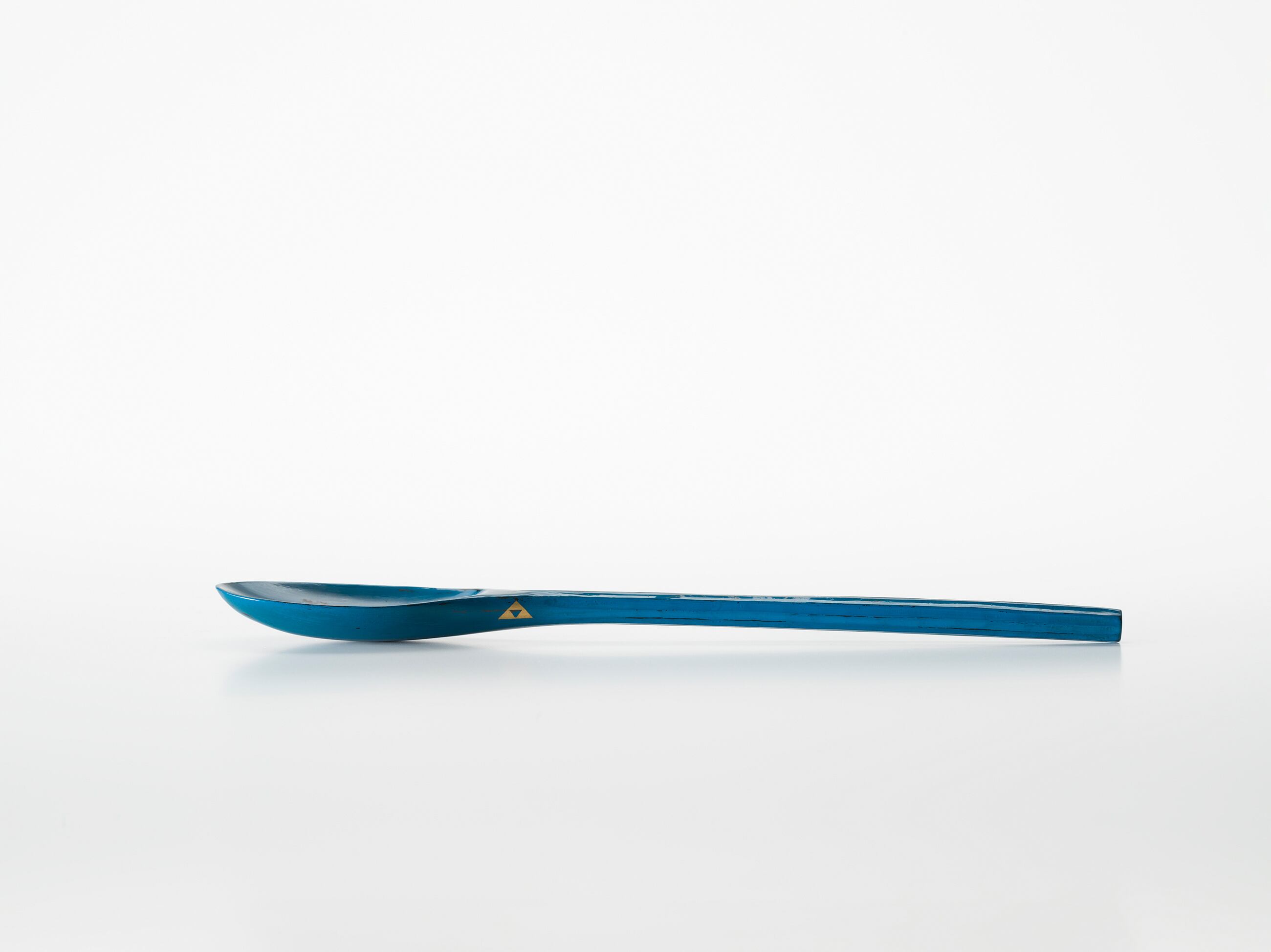 古都鎌倉を代表する伝統工芸「鎌倉彫」のスプーン。 丁寧に彫り上げた後、黒漆に青漆を塗り重ね、下地の黒を砥ぎだしています。漆がしっとりとしたフィット感、口当たりの良さを与えてくれます。側面に建長寺の寺紋「三つ鱗」を金箔であしらいました。全ての工程を手仕事で丁寧に仕上げています。