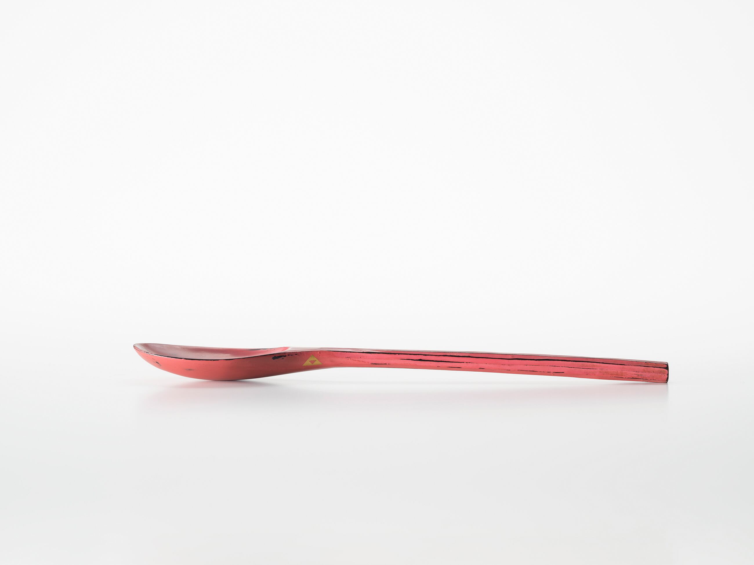 古都鎌倉を代表する伝統工芸「鎌倉彫」のスプーン。 丁寧に彫り上げた後、黒漆に桜色の漆を塗り重ね、下地の黒を砥ぎだしています。漆がしっとりとしたフィット感、口当たりの良さを与えてくれます。側面に建長寺の寺紋「三つ鱗」を金箔であしらいました。全ての工程を手仕事で丁寧に仕上げています。
